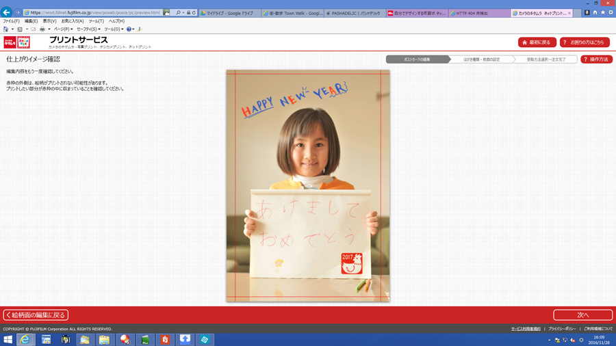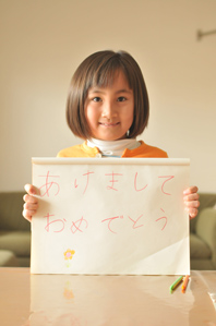 このタイプは自分でデザインした写真が全面プリントになるタイプです。「画像を加工するソフトがなければ文字を入れることができないんじゃないの?」と思う方もいると思いますがそれなら最初から文字を書いたものを写真に入れておけばいいのです。作例1は今回使った素材写真です。あけましておめでとう、と書いたお絵かき帳を持ってもらって写真を撮りました。これなら画像加工ソフトがなくても文字を入れた写真素材になります。お絵かき帳には今年の目標を書いてもいいですし短い挨拶文を書いても楽しい年賀状になると思います。