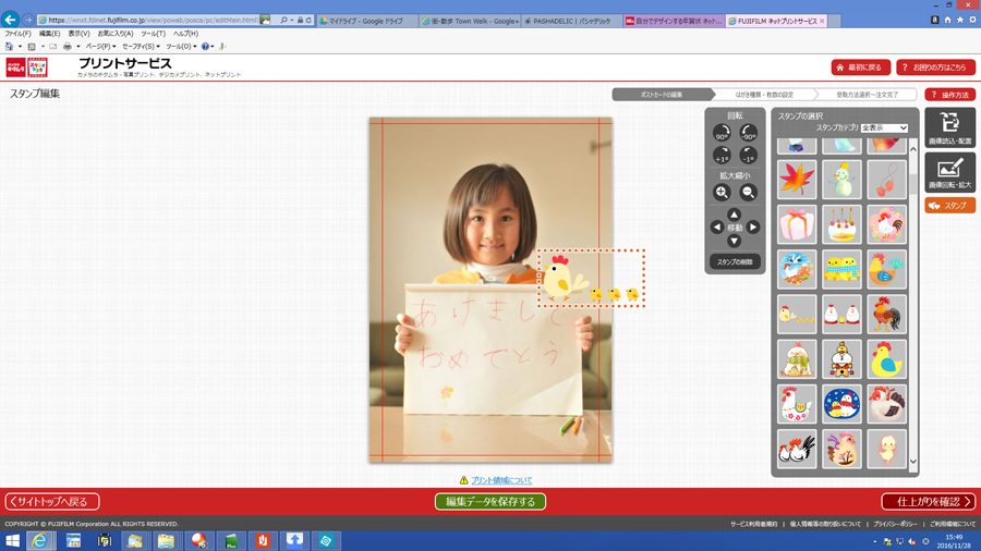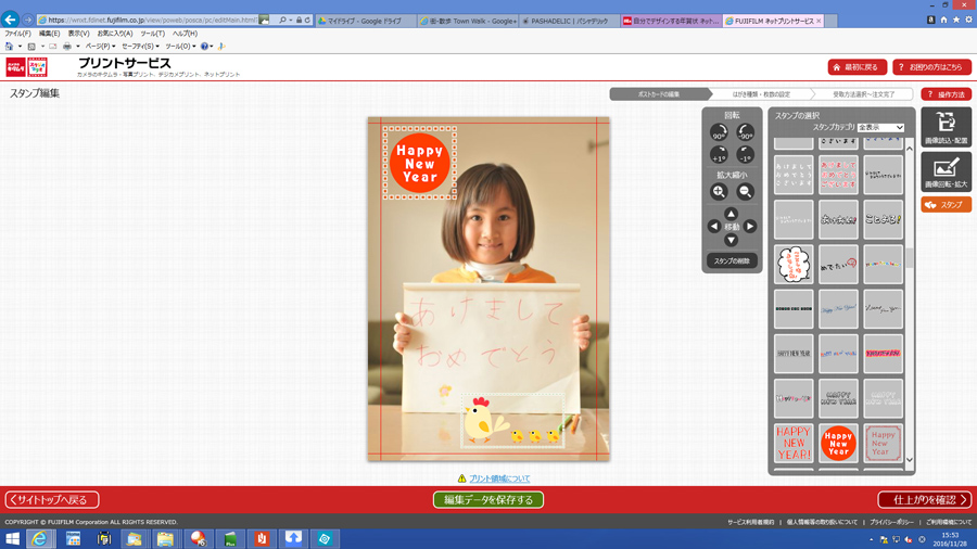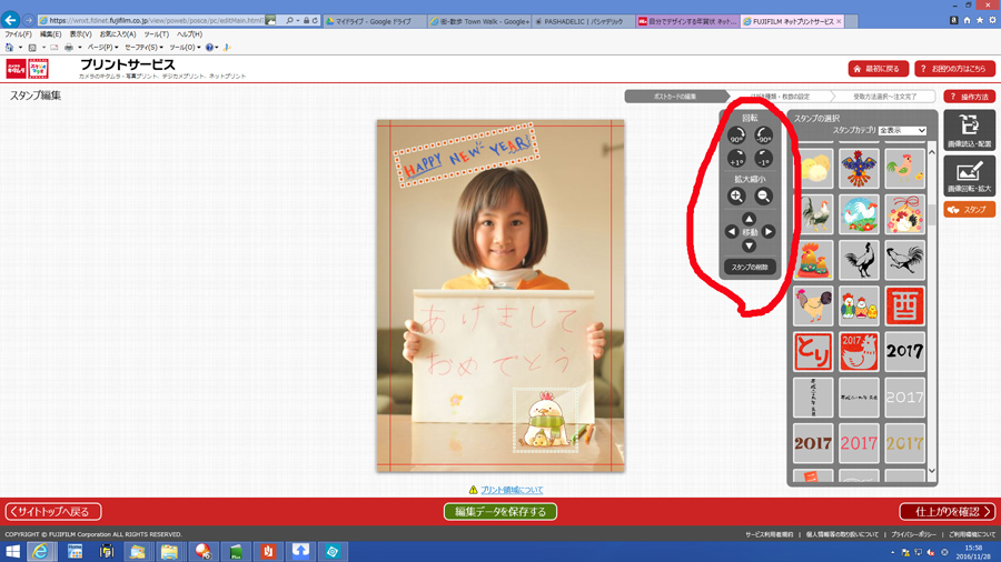 一度入れたスタンプを削除して別のものに入れ替えることもできます。画像4ではニワトリのイラストを変えてテーブルに座っている感じのものにして、文字も変えてみました。このように自分で自由な組み合わせでスタンプを変えられるのでテンプレートよりも手はかかりますが自分好みの絵柄を作ることができます。最後に絵柄を確認して出来上がりです。(画像5)もちろん確認してイメージが違うと思ったらまた戻って作業することができます。今年も写真を使って楽しい年賀状を作ってみましょう。