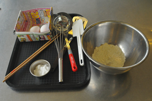 レシピサイトには必ず材料の分量が箇条書きで書かれています。当たり前のことではありますが、できれば材料と使う道具の集合写真(作例1)を載せておくと親切だと思います。文章に書いてある物を読めばわかることはわかるのですが1枚の写真で見ることができるとわかりやすいです。特に道具などは文章で羅列するよりも写真で見たほうが「あ、これとこれね」と、すぐに把握することができます。長女が小学生の時ですが、初めてレシピを見ながらお菓子を作ったとき、分量を間違えてなんだか予定とは別のものができてしまったことがありました。何をどれくらい入れたのかを後で聞いてみたら「それおかしいでしょ、なんで気が付かなかったの?」というレベルで分量を間違えていました。たぶん写真を見ていたら気が付いたと思います。