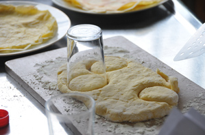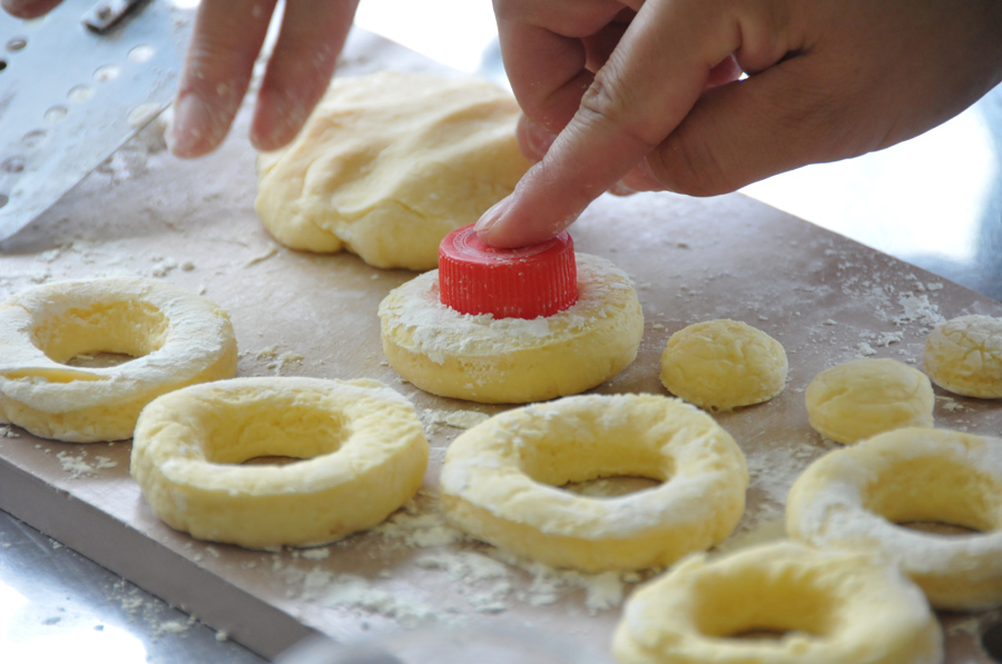 料理の写真は順光で撮るよりもちょっと逆光で撮ったほうがきれいに写ります。手順の写真も同じでちょっと逆光で撮ったほうが、立体感が出ていいと思います。作例2は生地を丸く抜くためにコップを抜型に使っているところです。生地をだいたいどれくらいの厚みにしたらいいのかとかコップの使い方など目で見てわかるように写しましょう。ストロボは使わず、できれば窓の近くで逆光気味に撮るのがおすすめです。窓からの自然光なら色もきれいに出ますし、電灯などの照明よりもきれいに写すことができます。また、道具の使い方ですが、作例3はペットボトルのキャップで穴を抜くところです。抜型を使うなら説明しなくてもだいたいどう使うかの見当が付きますが、本来ペットボトルのキャップはこういうことに使うわけではないので、どう使ったらいいのかをわかりやすいように写真で見せてあげると親切です。