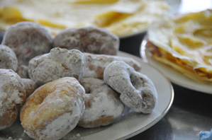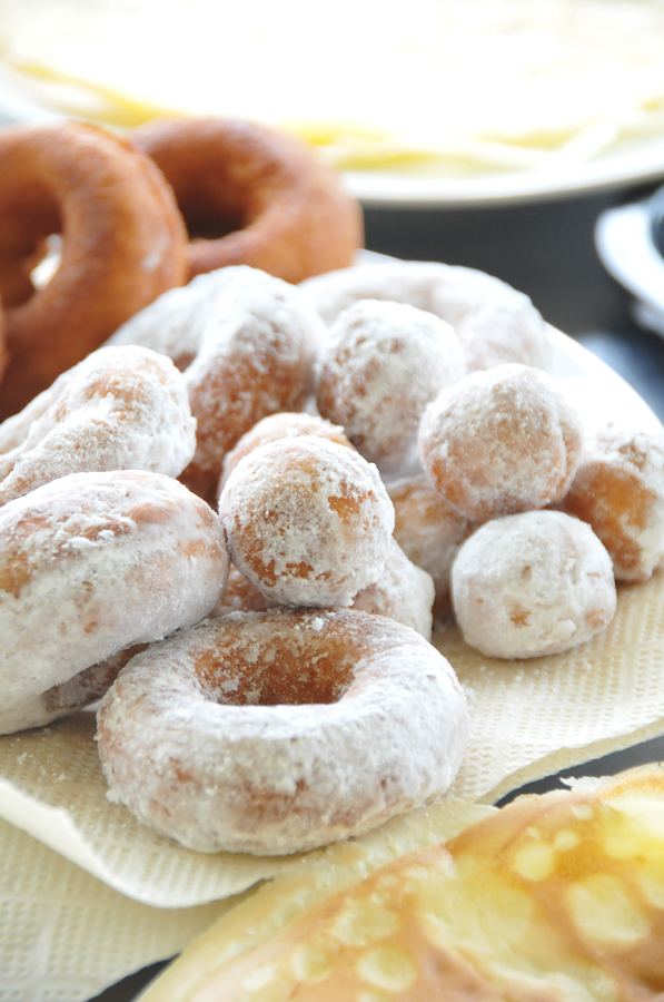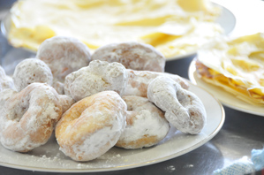 さて、逆光で撮ると手前が暗くなりがちです。また、今回主役に撮ったのは粉砂糖をまぶしたドーナツですからかなり白っぽい被写体です。これを露出補正なしで撮ったのが作例1です。実際の見た目よりもかなり暗く写っています。逆光の時は+補正が必要なことが多いのですが、今回は被写体が白いこともあり+1.7補正してちょうどよい明るさになりました。(作例2)最近の料理本等で見られるような明るい背景、または明るい色のマットの上などに料理を置いた場合それだけでも画面全体が明るい調子になりますから、さらに逆光で撮るとなると+補正は必須と考えていいでしょう。補正量は場合によりけりなので一概には言えませんが、モニターで確認しながら何枚か補正量を変えて撮れば、失敗せずに撮ることができると思います。