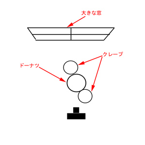 前回もお話したのですが、光は逆光がおすすめです。今回の作例は学校の調理室で撮ったものでかなり大きな窓がある広い部屋と言う状況でした。大きな窓があればご家庭のリビングなどでも同じような撮り方ができるので参考にしてもらえればと思います。図のように窓の前のテーブルにドーナツのお皿を置いてカメラを構える感じです。写真を撮るときに色を忠実に出すには順光でと言うのが基本とされています。確かに色だけについていえばそうなのですが、順光よりも逆光のほうが質感や立体感を出すことができるのです。普通の部屋であれば窓からの逆光で撮っても、周りの壁からなどの反射で部屋全体に光が回りますから手前からの光が全くないわけではありません。ですので手前が真っ黒につぶれることもほとんどないのでここは逆光を選択しました。