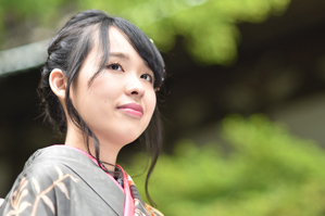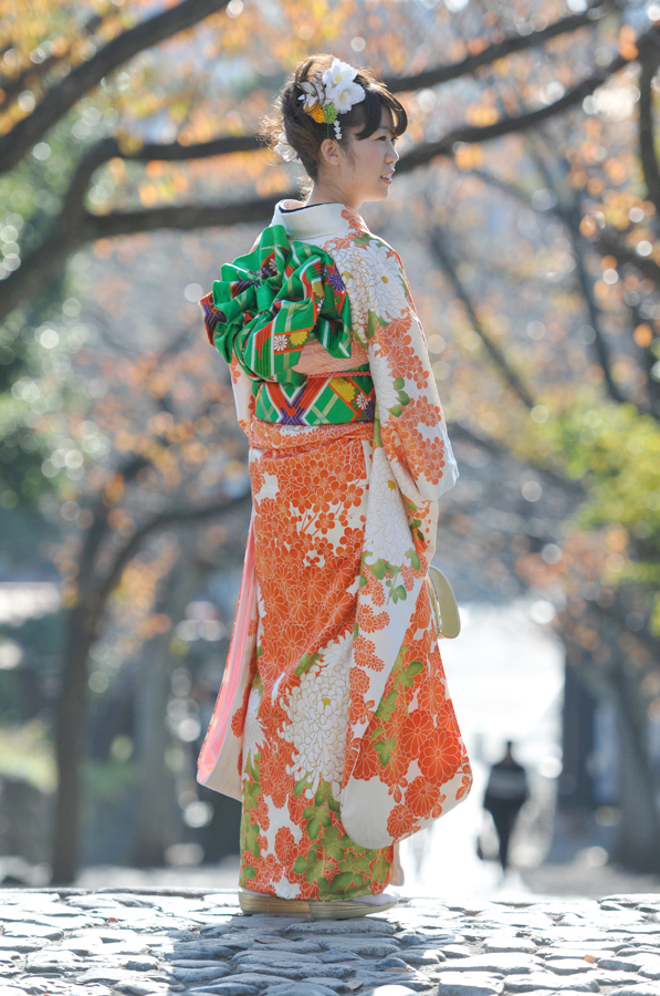 着物は前から見たところだけでなく後ろ側も撮っておきましょう。特に成人式の振袖は帯が凝ったデザインに結ばれていることが多く、後ろ姿も大事な記念になります。後ろから全身を撮るときは基本的には前から全身を撮るときと同じように撮れば大丈夫です。ちょっと離れたところから望遠で撮れば背景をぼかしやすくなります。また、背景をぼかすには遠い背景を選ぶことも前から撮るときと同じです。しゃがんで腰くらいの高さから撮れば全身のバランスもきれいに撮れますし背景に地面が入る範囲がすくなくなり、すっきりした写真を撮ることができます(作例3)。ただ、離れたところから望遠で撮っているとカメラと人物の間を人が横切ったり、後ろの方に入った通行人が大きく写ったりするので、なるべく近くの人が入らないタイミングを見計らって撮りましょう。