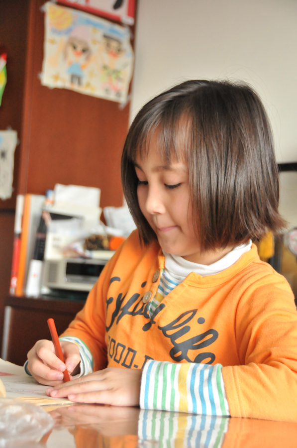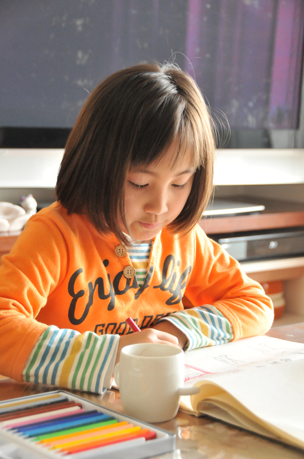 作例2では子供の手前に飲み物のカップが置いてあります。このままだと手元が見えないのでちょっとカップをどかして撮ったのが作例3です。子供がお絵かきをしているところなので手元が見えるようにしたほうが何をしているのか見た目にわかるようにしたほうがいいでしょう。それに手の表情なども写真で伝えることができます。お絵かきに限らず工作などでもそうですが何かを作ったり描いたりしているところを撮るときは手が写るようにしたほうが雰囲気が出ます。子供の写真を撮ろうとするとついつい顏だけに意識が集中しがちですが、手の表情もまたかわいいのでできれば手も入るように撮るといいと思います。