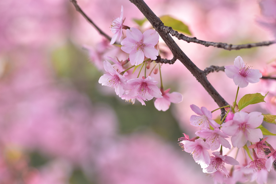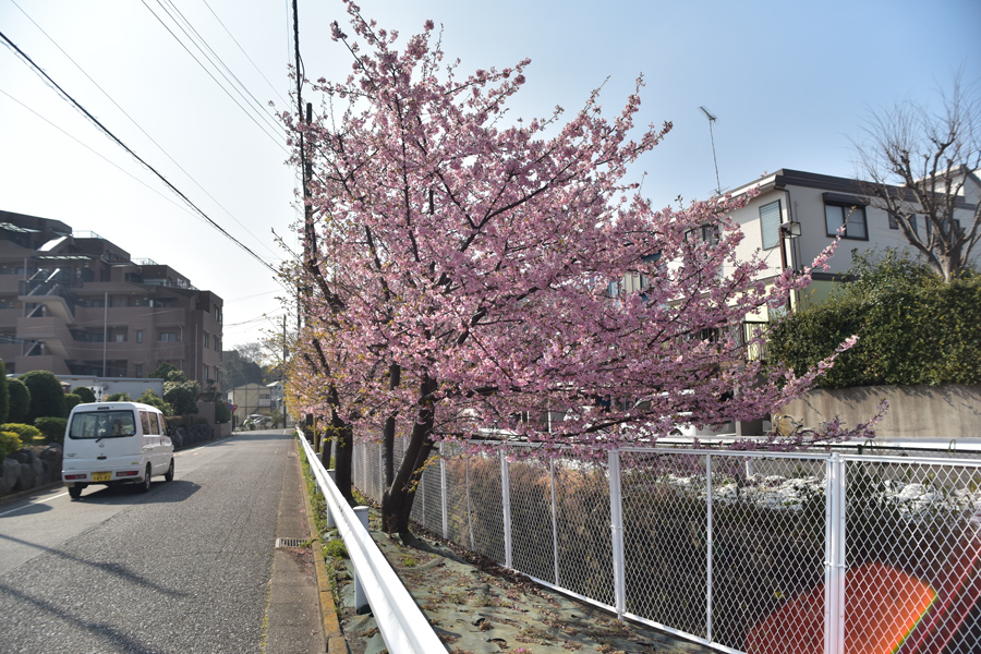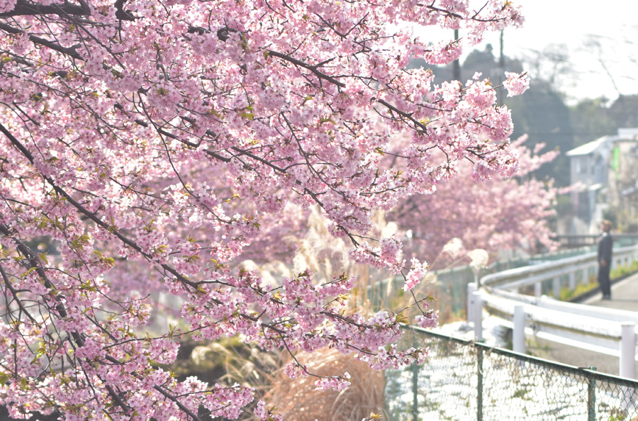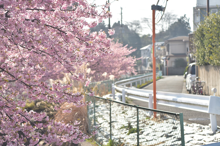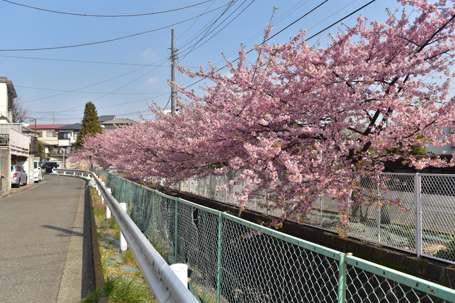 私の住む地域で最初に咲き始める桜は河津桜です。よく車で通り過ぎる道路沿いに何本かの河津桜が植えてあり、染井吉野よりも濃いピンク色のサクラが3月はじめくらいに見ごろになります。今年は咲き始めるのが早くて2月から結構花が開いていました。小さな川に添って20メートルくらいの間植えてあるだけですがとてもきれいで、咲き始めるとこの桜を眺めながら歩いている人もよくいます。普段公園などで桜を撮っていると、人を入れないようにとか人工物を入れないようにするのがけっこう大変です。でも「別に山に桜を撮りに行っているわけではなし、街中で撮っているのだから無理して自然風景風にしなくてもいいか」と思い今回は周りの人工物とか人も入れながら撮ってみようと思いました。