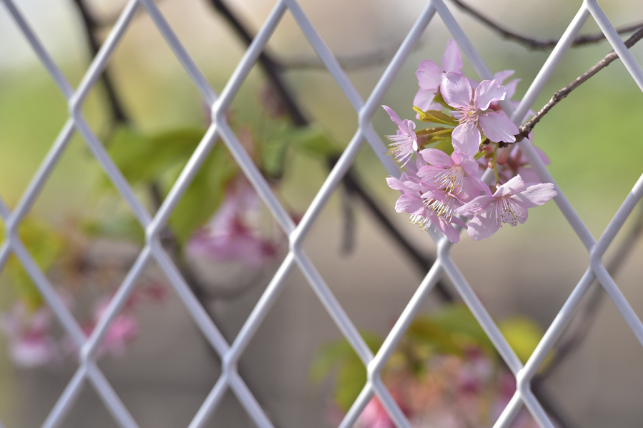桜の周りをウロウロしていたら、金網の間から顔を出して咲いている桜がありました。これもいいかも、と思いアップで撮ってみました。反対側の金網は青い金網なのでこれはさすがにきれいに撮るのは難しいと思いましたがこちら側の金網は白だったので、強い色ではなくまあ許せる範囲内だろうという感じです。後ボケにほかの桜の枝が入るように会うグルを探して、ちょっと中心から外すようにフレーミングしています。このように小さな素材を見つけることも写真を撮る楽しみの一つです。2~3枚撮って終わりにせず心に引っかかる素材を見つけてみましょう。