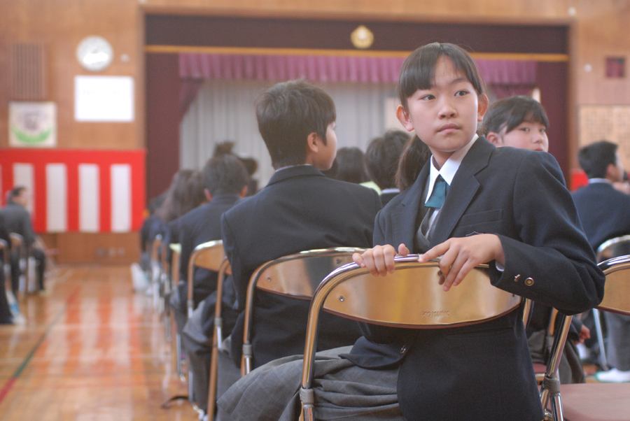 たいていどこの学校も入学式は体育館にイスを並べて行っています。そしてこれもよく見かけるものですが、壁に紅白の幕が張ってあります。作例3は着席した後、式が始まるまで時間があったので撮ったスナップで、知っている友達の姿を探して後ろを眺めているところです。室内でやや暗い状況ですがISO感度を高めにすればストロボなしで撮ることができます。記念写真と違ってその場の雰囲気を写したいスナップの場合はノーストロボがおすすめです。この時はF値を開放にして後ろにいる他の子供たちをぼかすように撮りました。これでも悪くはありませんが、入学式のイメージを強調したいと思い、左側の通路を入れて向こうの壁に張られている紅白の幕を入れてみたのが作例4です。この紅白の色が入ると入学式らしい雰囲気になります。また長い通路を入れたことで写真に奥行きを持たせることができました。もちろん新しい線服を着ているところを写真に撮るだけでも家族にとっては思い出になりますが、入学式らしい背景や脇役を画面に入れて撮るように工夫すると、よりよい記念の写真にすることができます。地域やその学校によって入学式もいろいろだと思いますがその場にあるものを利用して自分なりの工夫をしてみましょう。