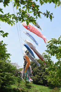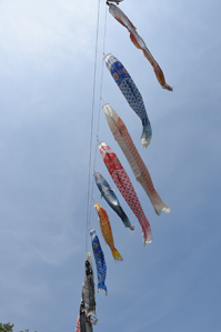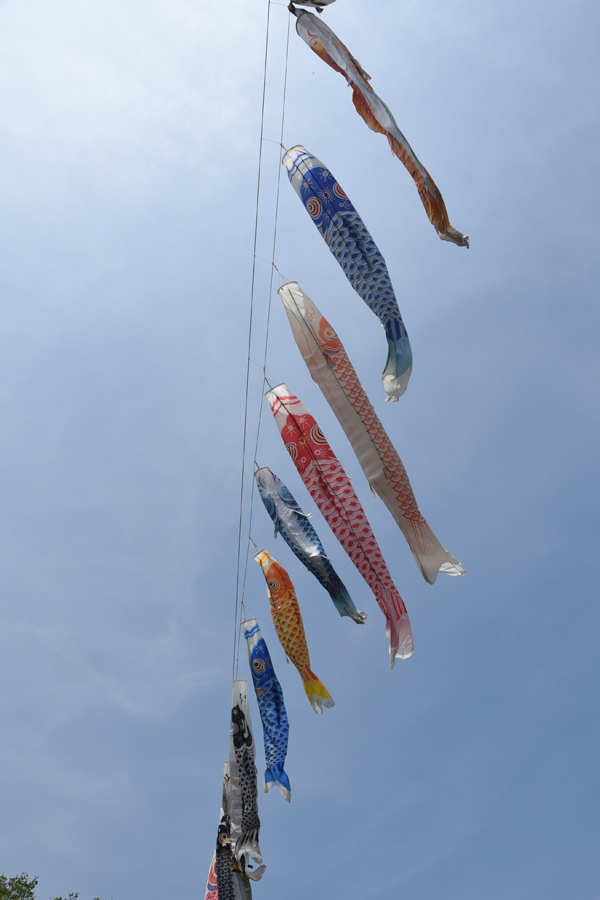 一般的なご家庭で飾るこいのぼりは長いポールなどを垂直に立て、3~5匹のこいのぼりを縦に並べて飾るのが一般的だと思います。しかし、行楽地やイベント会場に飾られているこいのぼりの場合は広い敷地に横に長いロープを渡し、100匹かそれ以上の数のこいのぼりをそのロープにつないで泳がせていることが多いようです。たいていの場合高いところに飾られていますから近くから撮ろうとすると見上げて撮ることになります。そうすると自然と背景は空になります。こいのぼりと青い空、そこに千切れた雲なんかがあればそれだけでも絵になりますが、お天気は人間の自由になるわけではないので青空ではなく薄曇りの白い空であったり、晴れていてもちょうどよい雲がういていない場合もあります。作例1は地元の公園に飾られていたこいのぼりです。下から見上げるように撮っているのと、可能な限り近くから撮れる場所がこの方角しかなかったため、ちょっと逆光気味で空の色も薄い青になってしまっています。この空だけでは背景としてちょっと物足りない感じです。