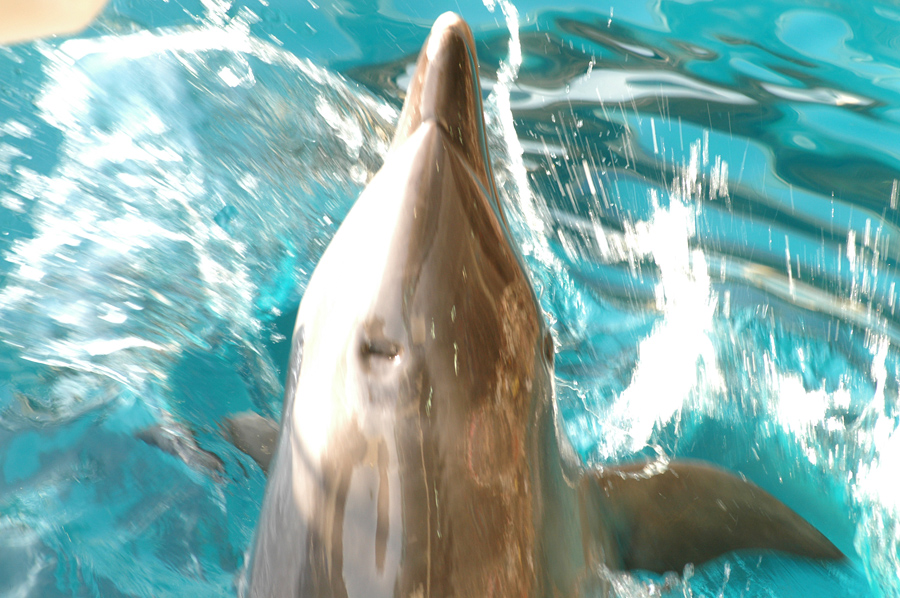 水族館の館内は水槽の様子を見やすくするため照明が暗目になっていることが多いのですが、イルカショーなどを見せるプールは屋外であったり室内でも明るめの照明があることが多いので館内ほど暗いことはないと思います。ただ、屋外でも悪天候に備えて屋根がかかっている場所が多く、日中でも日陰の状態になっていることがほとんどです。イルカショーを撮るときはシャッター速度を高めに設定しましょう。イルカは動きが速いということもありますが、イルカが立てる水しぶきがぶれると写真がきれいな印象になりません。作例1はシャッター速度1/100秒で撮っています。イルカがその場でくるくる回っているところなのでそれほど動きの速い演技をしているわけではありません。ちゃんとカメラをホールドしていれば手ぶれは防げる速さですが、イルカの動きも水しぶきもぶれてしまっています。一方作例2の方は1/250秒で撮っています。こちらは何とかぶれずに撮ることができました。1/250秒くらいがぶれを防ぐギリギリの速度だと思います。出来れば1/500か1/1000秒くらいの設定で撮れば安心です。