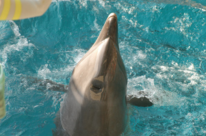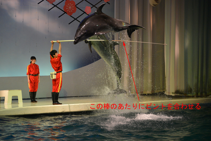 イルカショーの見どころはジャンプです。イルカショーを見ていても「ジャンプです」というアナウンスが聞こえるとカメラを構える人がたくさんいます。ショーの内容によって違うことなのですが、もしどこでジャンプするのかが予めわかるような内容の演技なら、飛ぶポイントにピントを合わせて待ち、狙ったポイントにイルカが入った瞬間にシャッターを切る、いわゆる置きピンで撮るのがおすすめです。イルカが水中から飛び上がってからあわててピントを合わせようとしても一瞬でピントを合わせるのは難しく、ピントがあったときにはもう飛び終わって水中に飛び込んでしまっている、なんてことになりかねません。上からつりさげられたボールにイルカがタッチするとかポールの上を飛び越えるという内容の演技ならそのポイントにピントを合わせて待っていてタイミングに集中して撮るときれいに撮れます(作例3)。