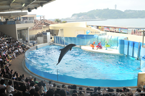 特にイルカがどこで飛ぶかが決まっていない演技の場合はプール全体が入るようにフレーミングして撮ると失敗がありません。以前「たぶん中央で飛ぶんだろうな」と思ってプール中央を狙って待っていたら、意外と端っこの方でイルカが飛んでしまい撮れなかったことがありました。もちろんプール全体をフレーミングしていても中央で飛んでくれた方が構図のまとまりはよくなります(作例4)。ピントは中央あたりに合わせておいて、イルカが飛んだらシャッターを切りましょう。どこで飛ぶかはイルカの自由なので、中央で飛んでくれるかどうかはわかりませんが、とりあえず「飛んだら撮る」を繰り返してみましょう。