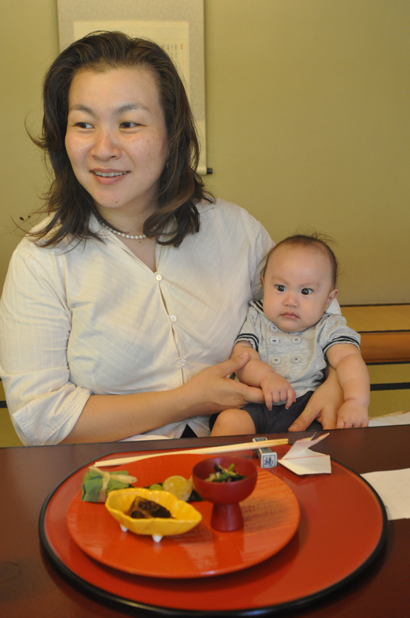 今回は以前に撮ったお宮参りの写真で、お宮参りの後に家族で行ったお食事でのスナップです。お宮参りの神事の後、家族で行くお食事なのでちょっとリラックスできる状況です。自然な表情を撮ることをメインにしてみましょう。お宮参りが終わっているので主役の男の子はさっさと普段着に着せ替えられてしまいました。さらにお食事もこの男の子はまだ離乳食ですからレストランで出される食事は家族のためのものです。正直に言って本人よりもその家族のためのイベントのようなものです。ここは家族みんなのスナップを撮る場と思って撮影していました。
