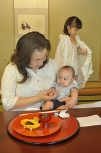 本人は食べられなくてもその時出たお料理を入れて写真を撮っておくと後でよい思い出になります(作例1)。家族の自然なスナップですから、後で眺めて楽しめるように工夫して撮りましょう。また、後でアルバムに組むときのためにお料理のアップも撮っておくのがおすすめです(作例2)。アルバムに組むときは見開き単位でかっこよくレイアウトできるのがベストなのですが、例えば室内の写真だけで組みたいと思っていたページにどうしても空きスペースができてしまう場合など、こういった物のアップの写真などがあるとスペースを埋めるのに便利です。また、お料理は食べればなくなってしまうものなので写真に撮っておくとそれも思い出になります。