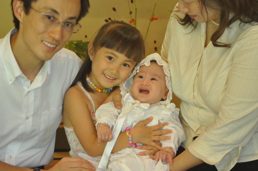 作例3は作例1の後に撮った写真です。弟君が脱いでしまったベビードレスをお姉ちゃんが肩にはおっています。白くてレースがたっぷりついたベビードレスはお姉ちゃんにとって興味あるお洋服だったのでしょう。ベビードレスを肩にかけたお姉ちゃんが後ろに入るように撮りました。こうすると、その時の様子がよく伝わる写真になります。また、後ボケに家族が入っていると家族の温かい空気感が伝わってきます。