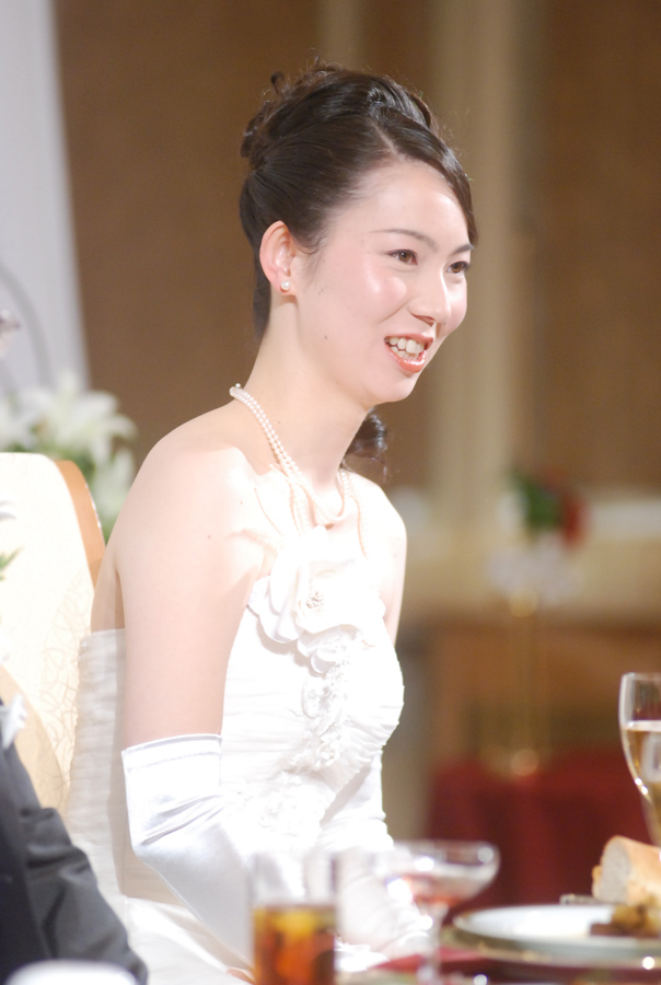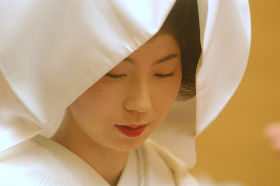 結婚式の主役は花嫁です。もちろん結婚する二人が主役なのですから花婿も主役なわけですが、写真を撮る場合花嫁のきれいなカットは絶対必要です。プライベートで友人の結婚式を撮るときでも花嫁さんがきれいに撮れているカットがあれば、ほぼ確実に喜ばれます。元々きれいな花嫁衣装を着てきれいにメイクしているのですから、ちょっと光や表情に気をつけて撮ればきれいな写真が撮れるはずです。作例1は綿帽子からのぞく花嫁さんの顔をアップで撮りました。何カットか撮りましたが、ちょっと下を見たときの表情が一番きれいに撮れていました。衣装が和装で綿帽子の時にはこの角度がたいていきれいに撮れるので私は必ず押さえています。表情については花嫁さんのキャラクターにもよるので一概には言えないのですが、下を見たところ(伏し目がちな感じ)を狙うとこれも大体きれいに撮れます。