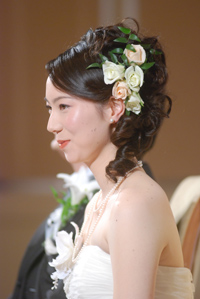 髪形や衣装によっては左右対称なデザインではなく、見る方向によって違う形になっていることもよくあります。ドレスなども片側に大きな装飾がある場合がありますし、髪形も左右どちらかにボリュームを出すデザインになっている場合があります。作例2の花嫁さんは髪を左側にまとめてボリュームを出す髪形でした。髪を飾る花も左側につけられていたので花が見えるように左側から撮りました。逆に右側から撮ったのが作例3です。衣装についていえば胸の飾りは右胸についているのですが、この大きさで撮る時は髪形が写真の印象に大きく影響するので作例2のように髪飾りの花が見える方向から撮ったほうがいいでしょう。