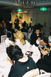 結婚式の写真を頼まれるときによく言われるのが「友人や親せきも入っている写真がほしい」ということです。招待客である家族や親せき、友人も入るように撮る場合は楽しそうなイメージで撮るようにするのがおすすめです。披露宴のスピーチを聞いて笑っている笑顔や拍手しているところなどを撮ると雰囲気のよい写真になります。作例4は二人が入場するタイミングで撮りました。新郎新婦が入場するときはみんなが拍手で迎えてくれますから手前に親戚の席が写るところで後ろに入場のドアが入るポジションであらかじめ待っていました。このほうがただ食事しているところを撮るより披露宴の雰囲気が出ます。ほかにも乾杯の瞬間やケーキカットなどで新郎新婦の周りに人が集まったときなどもおすすめです。みんなに祝福されているイメージを写真にするように工夫してみましょう。