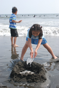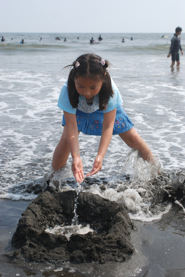 砂浜で子供たちを自由に遊ばせると、結構砂遊びも楽しいようです。砂山を作ったり、池を作ったりトンネルを掘るなど楽しそうに何かしら作っています。砂遊びのスナップの場合はその時に作ったものを一緒に撮りましょう。そのときどんなものを作っていたのかがわかる写真の方が後で眺める時に楽しく見ることができます。作例1は子供たちが掘った池に水を入れているところです。後ろでも手前でもいいので砂作品を一緒に撮っておきましょう。