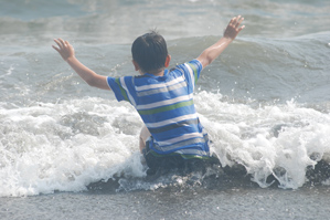 作例3は波打ち際で遊ぶ子供の後ろ姿です。普通子供たちは海の方に向いて遊んでいることが多いので自分が海に入らない限りは後ろから撮ることが多くなります。この時は一眼レフを持って行ったので「落としたり転んだりしたらカメラが水没する」と思い、浜の方から撮っていました。当然子供たちは海が見える方向を向いているので後ろ姿や横顔の写真が多くなります。後ろ姿を撮るときは何をしているのかわかる動作がある瞬間を狙うと感じが出ます。場合によっては立って景色を眺めているだけの後ろ姿でも絵になる場合がありますが、「遊んでいるところ」のイメージを出すには何か動作がある瞬間を狙いましょう。