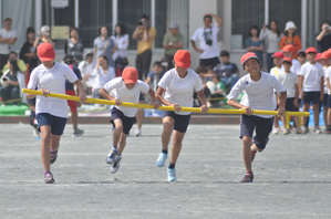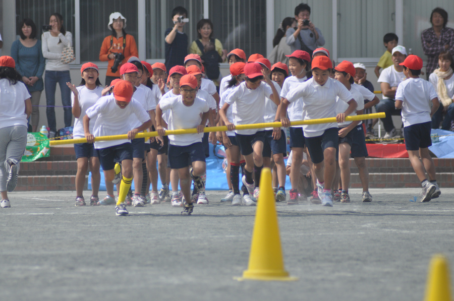 長い棒を何人かで持って並んで走る競技を運動会や体育祭でよく見かけます。大抵はパイロンなどが設置されていて、それを回りながら走って次の人にパスするという進行です。徒競走などもそうですが正面から撮る場合、スタート直後に撮ると後ろに並んでいる次の走者がすぐ後ろに写るので今走っている子が引き立たないという場合が多く見られます。私も自分の子供の番が来たら、すぐに撮りはじめますが作例1のようにスタート直後はいまいち絵にならない場合が多く、「これがベストかな」と思うのはだいたいしばらく走ってから撮った写真になります。正面から撮る場合スタート直後だと後ろの子がすぐ近くにいるので背景が、ごちゃっとしたイメージになってしまうからです。作例2の方は最初のパイロンを回った後くらいに撮っているので次の走者の子が重ならず、背景がすっきりしています。もちろん次の子たちが写っていても距離があればボケになりますからそれはそれでいいのですが、やはりある程度距離が離れてから撮った写真のほうが見栄えが良くなります。スタート直後から撮るにしても気合を入れて撮るのは走りはじめよりも中盤くらいと考えて撮るといいと思います。