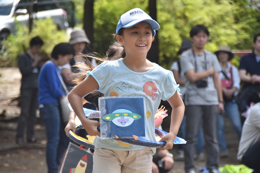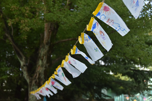 作例4は会場にかざられた旗の写真です。これは保育園の運動会で撮りましたが旗の一枚一枚が手描きの絵で、どうやら子供たちが一枚ずつ描いたもののようです。こういった工作物は記念にもなるので飾られた状態を撮っておくと良い思い出になります。また、後でアルバムを作るとき、写真をレイアウトしてみたら中途半端に空いているスペースができてしまったということがよくあります。そんな時そのスペースを埋めるのにこういった物の写真が役に立ちます。旗以外にもその時食べたお弁当の写真とか、プログラムの写真でもいいと思います。自分の子が描いた旗を見つけられたらその旗をアップで撮るのもおすすめです。