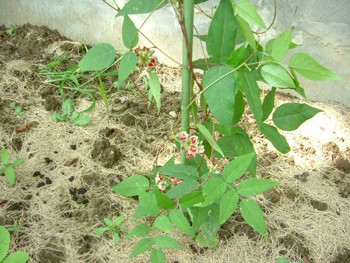 夏、葉のつけ根に淡赤緑色の蝶形の花が開き、その花は乾燥させてお茶にしたりもします。