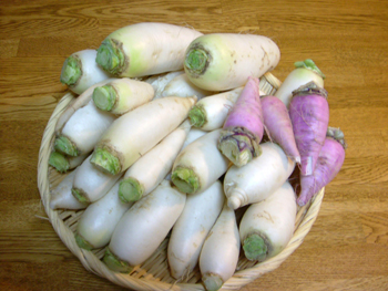 春に蒔いた辛味大根の成果。不揃いだが辛味がある。