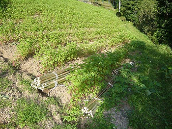 そこで、畝に竹竿を刺し、ロープを張り倒壊を防ぐことにした。