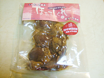 謳い文句が「北海道産の新鮮な帆立を清酒「宝川」で、したごしらえして、醤油とみりんとたかの爪で調味付けした、田中酒造、人気の珍味です!!柔らかな食感と、口の中にひろがる帆立の旨味が絶品です。」