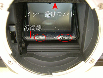 ミラー受けモルトは、遮光の役目とは違いミラーの衝撃を吸収する役目ですが劣化した当初は粘りがあり、剥離したモルトがミラーに付いたり、ミラーの戻りも一呼吸遅れがちになります。