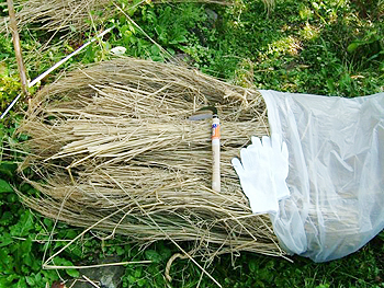 刈り取った蕎麦を束ねる稲藁は、知人である農家より分けて頂いた貴重品である。