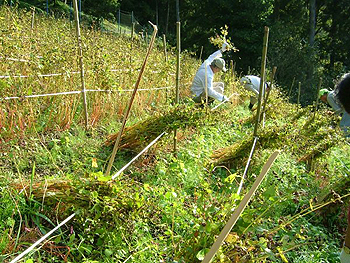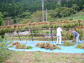 地元の方の協力で、2号畑に「はざかけ」を作り自然乾燥をさせる。