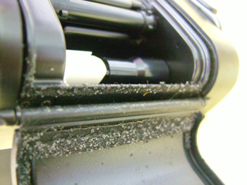 裏蓋のモルトが本体に転写してますね!そして、剥がれ落ちたモルトがスプール室に落ち汚染します。