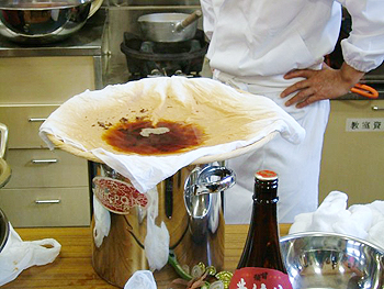 名店の蕎麦汁作りを盗むのに参加者の目は真剣です。