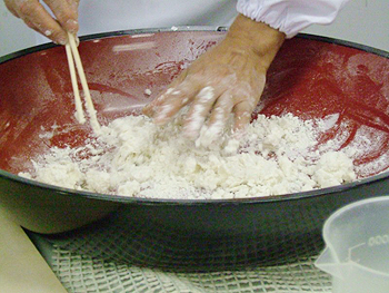 手の皮・面の皮が厚い人は直に捏ねられましょうが、アチチですから箸を使用し素早くかき回し、全体に行き渡るように手で揉み込むのです。