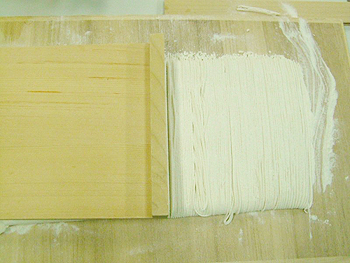 繊細な更科粉を何とか伸すことが出来、蕎麦切りしたところです。