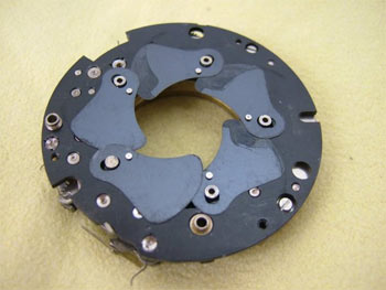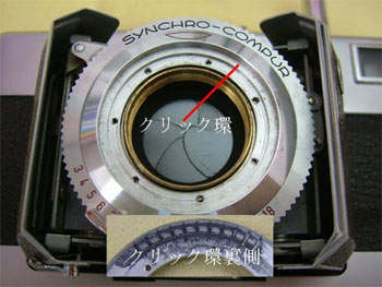クリック環を外す。表側に見える7カ所のネジ穴は、程良いクリック感を調整する為にある。クリック環の裏側にシャッター秒時クリックの溝がある。