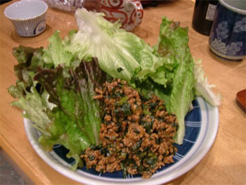 持ち寄りの料理です。サンチェにくるみ食べます。余りの美味しさにレシピを聞いちゃいました。