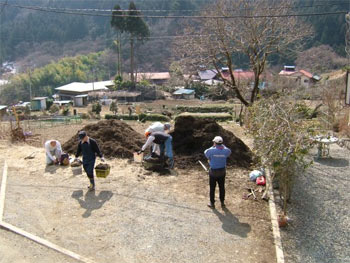 ギヤ~オの声の向こうに地元の方にお世話いただいた堆肥の山が二つある。事前に連絡メールで知らされてはいたが、10tの山は圧巻だ!平地の畑ならまだしも山間の畑は急勾配なのである。頼れるのは人力のみ。本日の運搬手段の13馬力を考えると、集まった人々は寡黙にならざる得ない。昨年は、4面で2tの堆肥であった。