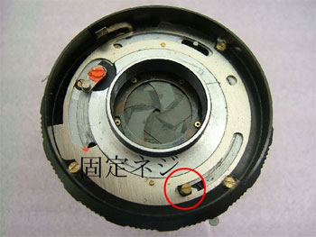 そこで、赤丸部のネジを長めにしてヘリコイドへ楔のように差し込み持病は全快しました。