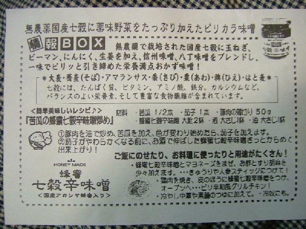満腹状態でありパンを食する気にはならないが「“からだ”が喜ぶ大地の恵み」のポップが目に付き、なんじゃろなと確かめると「七穀辛味噌」である。