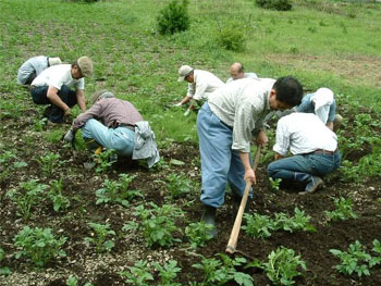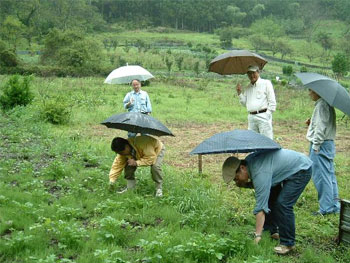 傘を差しての検分は、3月15日に植え付けた時と様変わりして、悪魔のスギナの絨毯に覆われておりました。雨足弱くならず一同、中止の話が纏まり温泉旅行となると所でした。