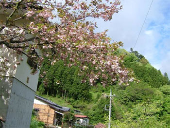 もそっと早く晴れてくれればと思いつつ、畑入り口にあります八重桜に別れを告げ、汗を流しに数馬の湯に向かいます。
