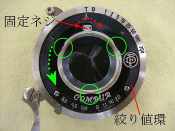 固定ネジを回転し、切り掛けを下側に向け絞り値環を緑矢印方向に回すと緑○部に押さえ部が位置し外れる。