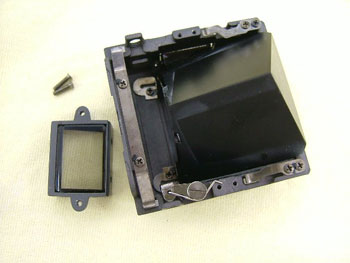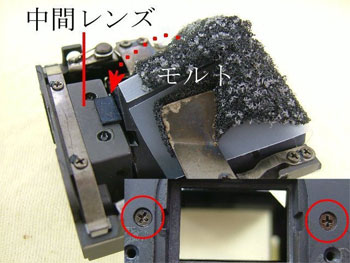 ペンタプリズム押さえの金具を外し、モルトを除去します。