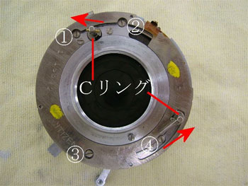 Cリングを外し、1から4のネジを外しますと前後に分離します。