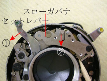 本来ならシャッターをセット(1赤矢印方向)しますと、スローガバナの歯車(2赤矢印方向)は速やかに動かなければなりません。