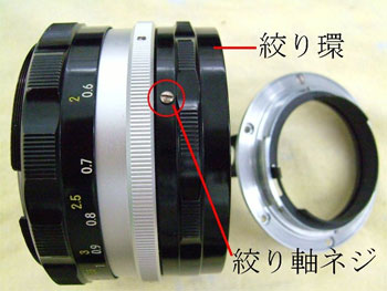 絞り軸ネジを外し、絞り環を分離する。