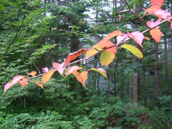 夜は短く、鶯の目覚ましが早く鳴きまして、早朝散歩に一人歩きましたら酒の匂いで色づいた一枝を見つけました。外気温21度、プライベート地の清里の森です。