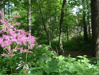 森の中の木漏れ日洩れる小径には野草が清々しい花を咲かせております。